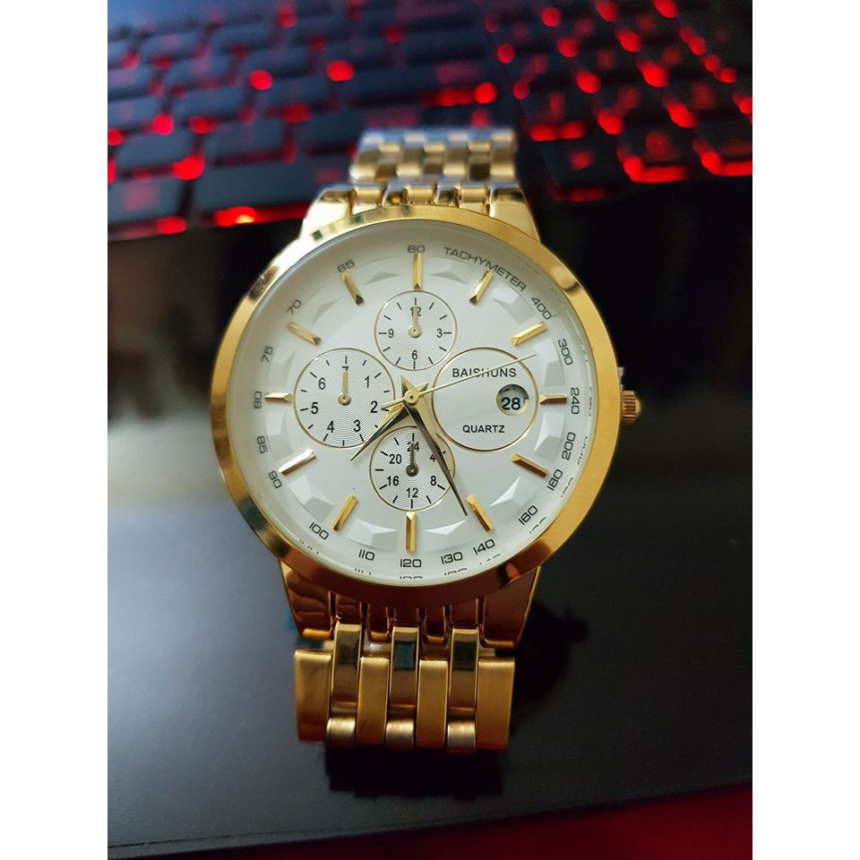 [Mã WTCHNOV20 giảm 20K ] (BIG SALE) Đồng hồ nam Baishuns khung thép mặt trắng mạ vàng cao cấp